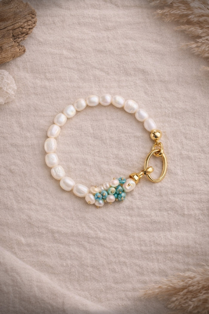 Gümüş Detaylı İnci & Turkuaz Zirkon Kilitli Bileklik